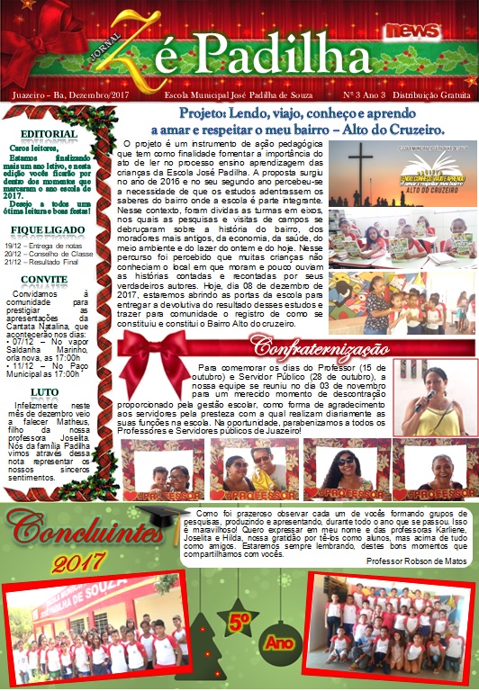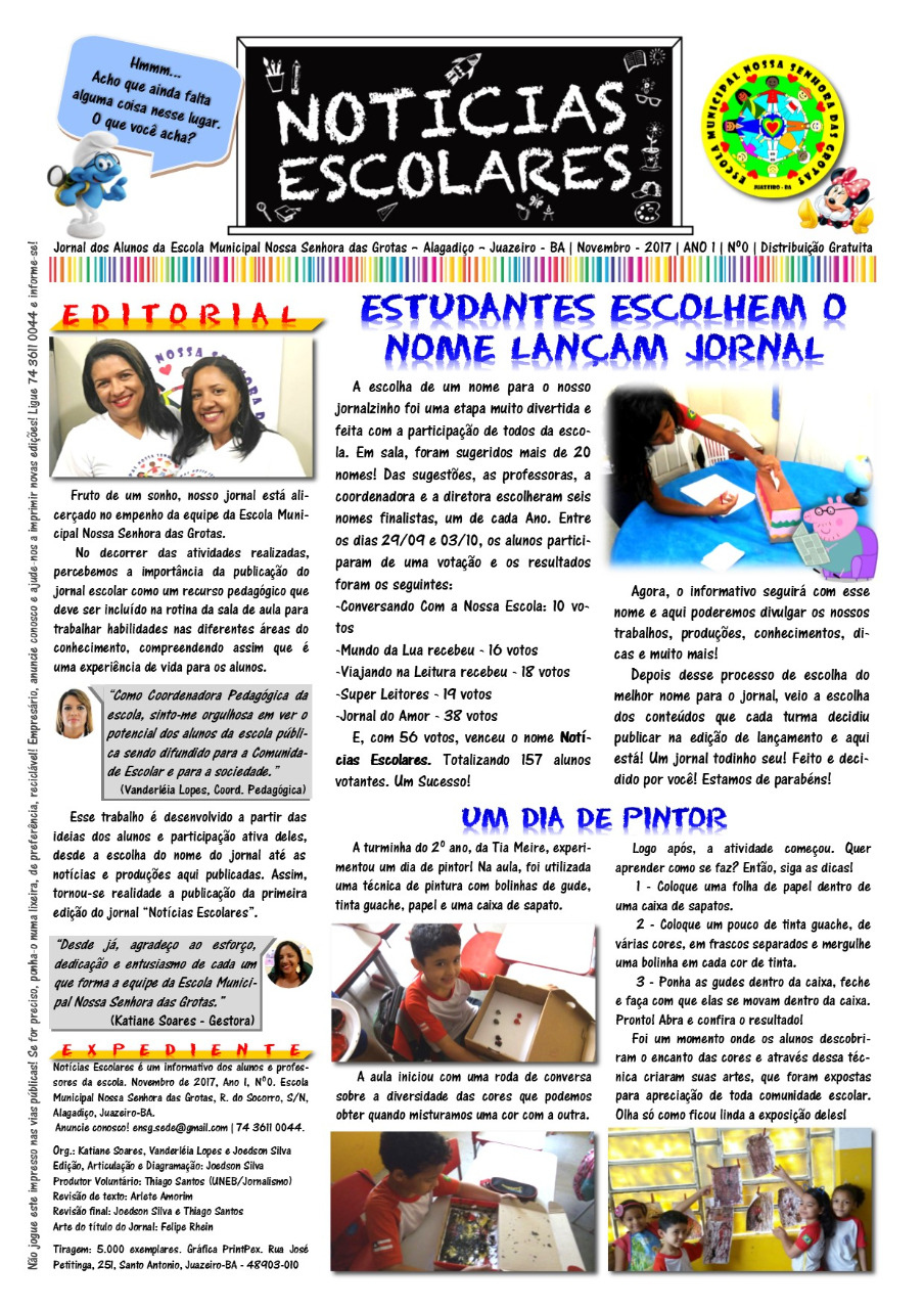 No dia 28/11 foi o belíssimo lançamento do Jornal “Notícias Escolares” da Escola Nossa Senhora das Grotas, o qual tem como editor e diagramador Joedson Silva. O lançamento do jornal Notícias Escolares foi um sucesso! Realizado em praça pública, o cerimonial foi conduzido pelos próprios alunos da unidade. Joedson Silva, o Articulador de Educação Tecnológica da Escola foi buscar parcerias e conseguiu o patrocínio de várias empresas para a tiragem de 5.ooo cópias nessa primeira edição.  Através do empenho da equipe da Escola Municipal Nossa Senhora das Grotas hoje alunos e comunidade podem usufruir de mais um meio de comunicação impresso.